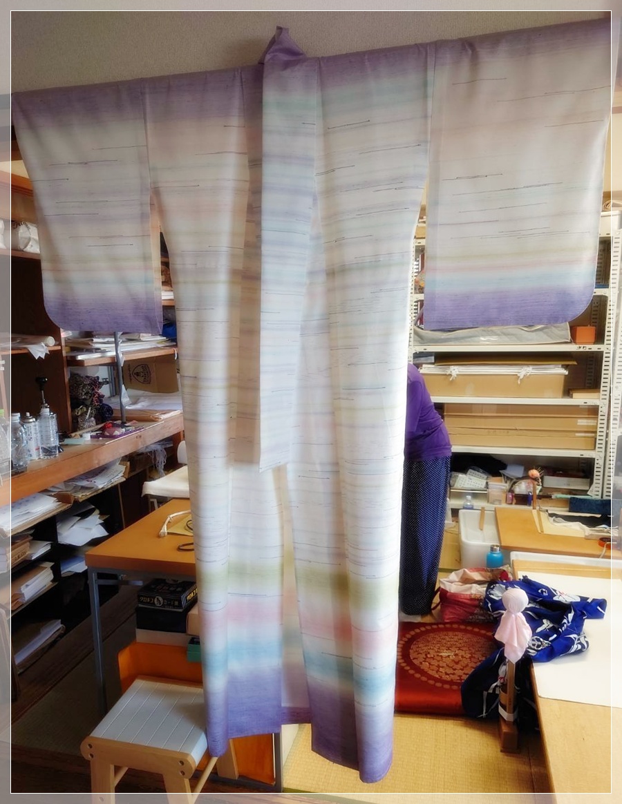 純白の生糸を、何種類もの草木を使い染め上げ、織り上げたこのグラデーションの美しさ!!見事です、人間国宝志村ふくみ先生の着物です